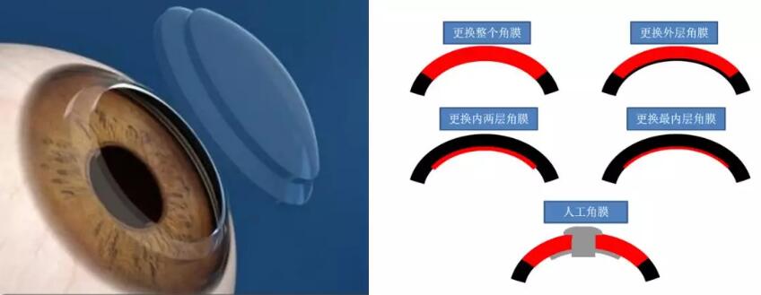 圖為:角膜移植的各種手術(shù)方式,紅色代表病變的需要更換的角膜
