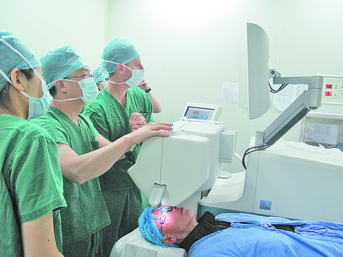 張廣斌主任(中)使用飛秒超乳設備為患者做白內(nèi)障手術