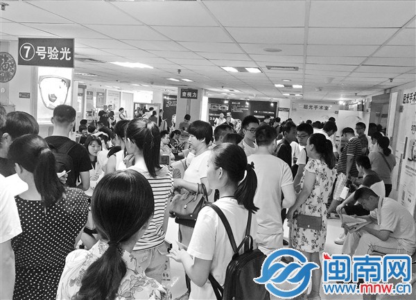 廈門眼科中心候診大廳擠滿陪同來做近視激光手術患者的家屬