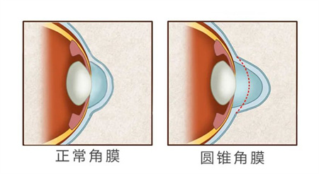 我們的眼睛從側(cè)面看上去,正常都是平緩的球形,圓錐角膜卻不是,圓錐角膜從側(cè)面看,更像一個凸起的椎體。
